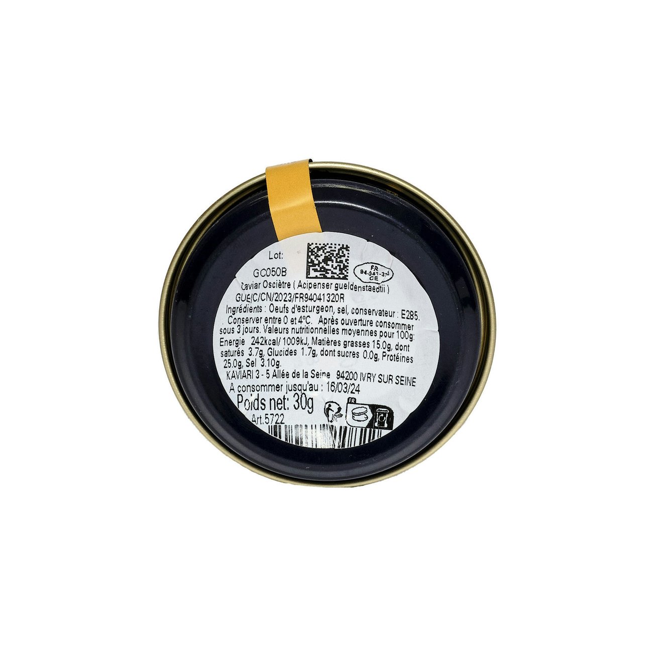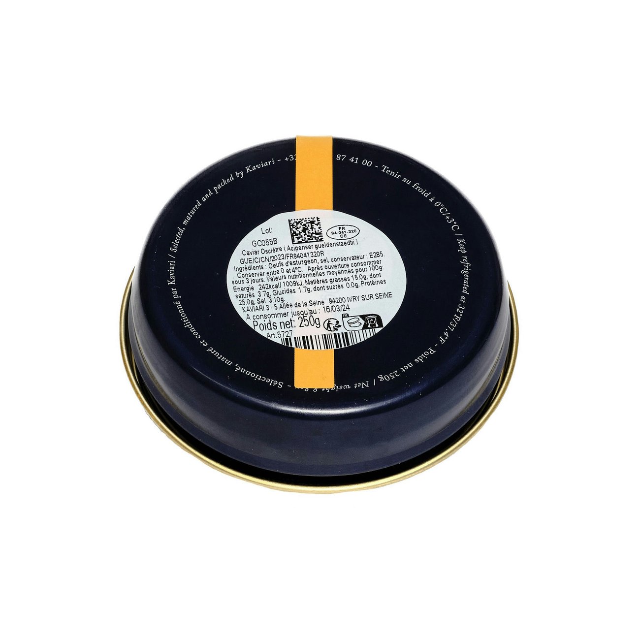 Caviar osciètre d’esturgeon “Acipenser gueldenstaedtii”. Grains aux tons ambrés à dorés, fermes et moelleux. Saveurs subtiles, marines et noisettées délicates.