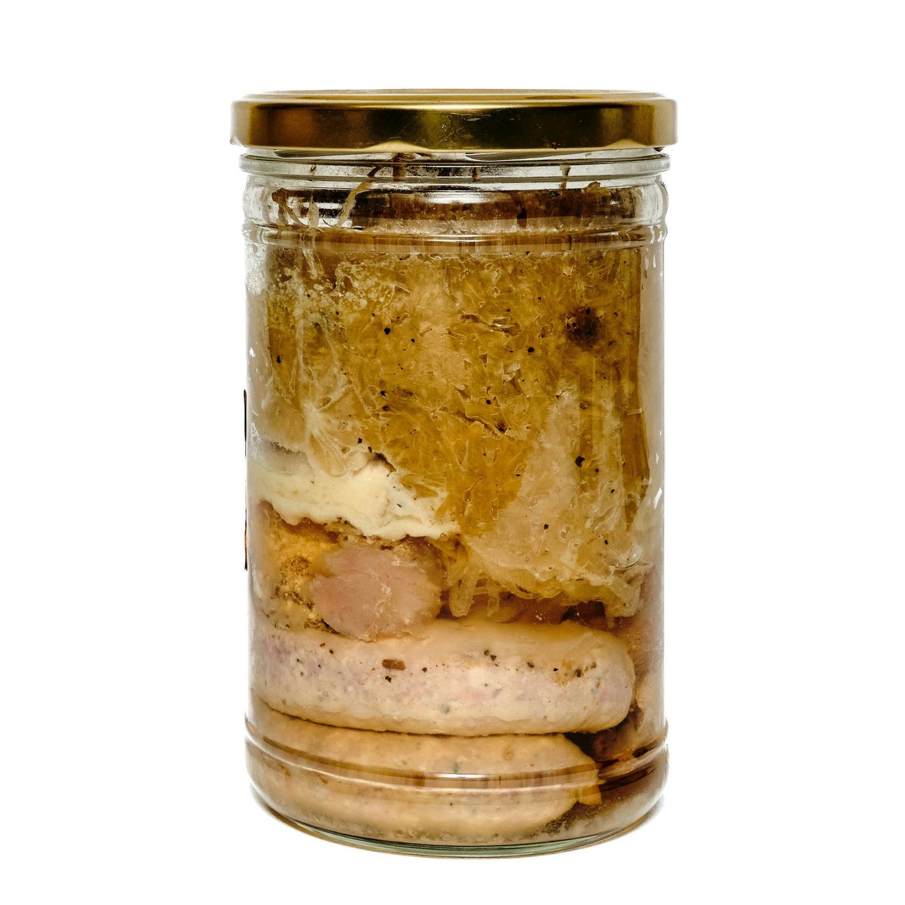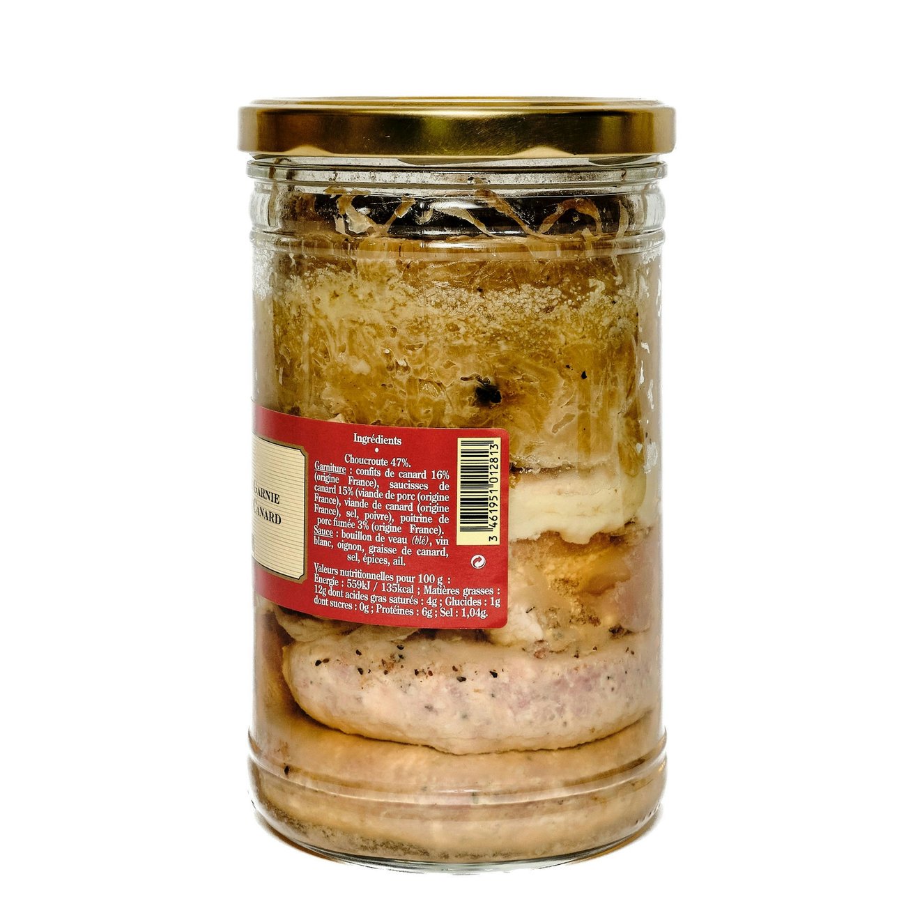 Bocal Conserve – Choucroute Garnie au Confit de Canard. Savourez une recette traditionnelle, alliant confit de canard, saucisse de canard et poitrine de porc fumée. À déguster chaud avec des pommes vapeur. Parfait avec un vin blanc d’Alsace. Gardez au frais et consommez dans les 48h.