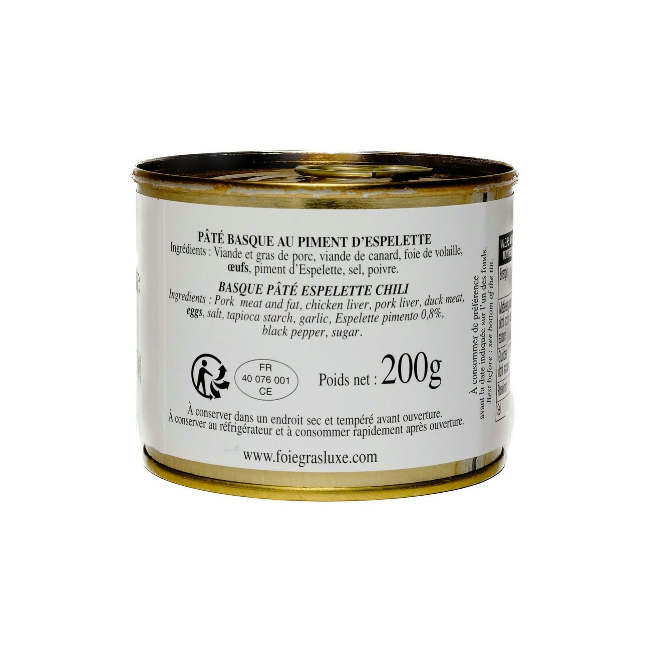 Découvrez le délicieux Pâté Basque, une véritable spécialité de l’épicerie fine, disponible sur notre site Foie Gras Luxe. Préparé avec soin, ce pâté est élaboré à partir d’un savoureux mélange de foie, de gras de porc et de piment d’Espelette, pour vous offrir une explosion de saveurs à chaque bouchée.