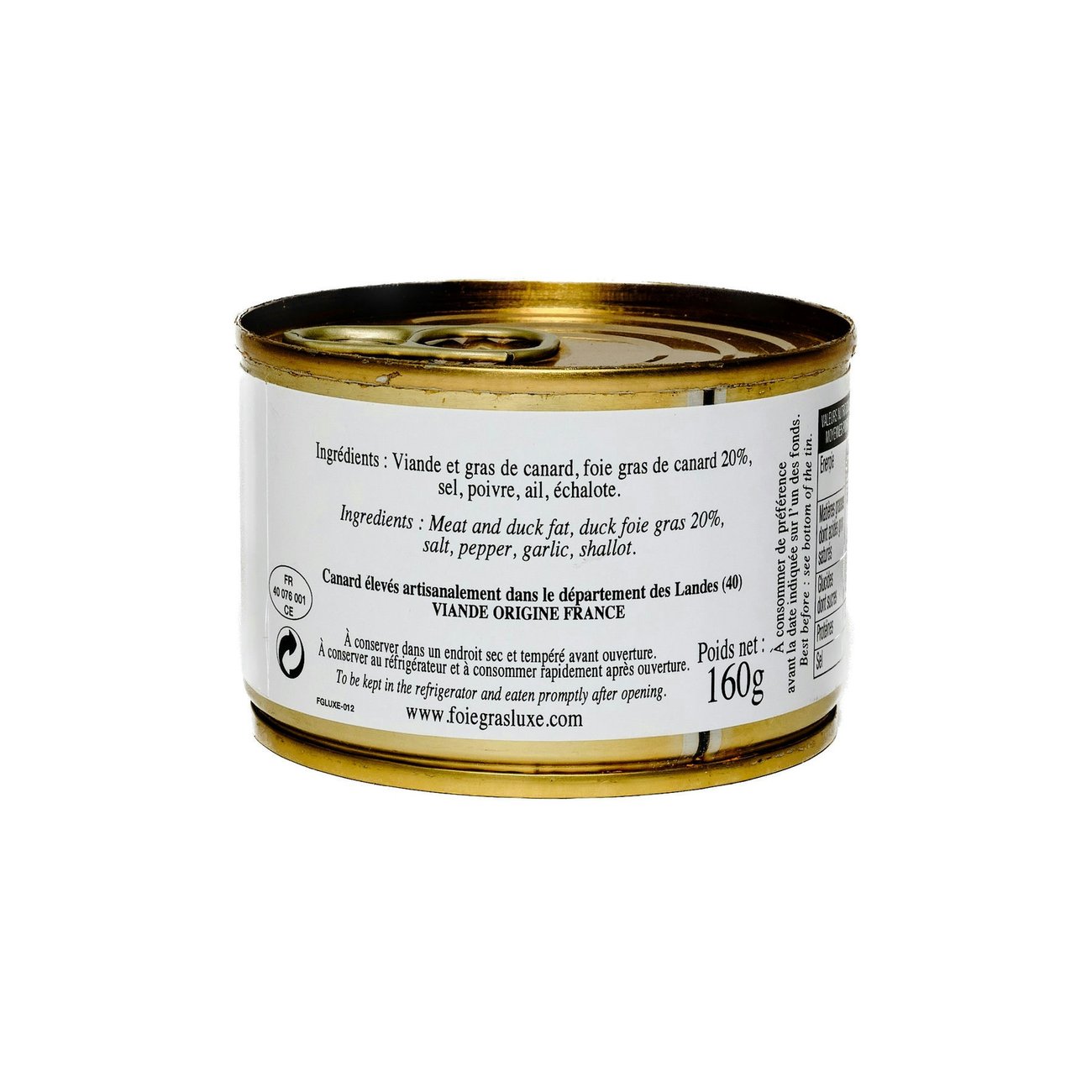 • Ingrédients: Viande et Gras de Canard, Foie Gras de Canard 20%, Ail, Échalote, Sel, Poivre