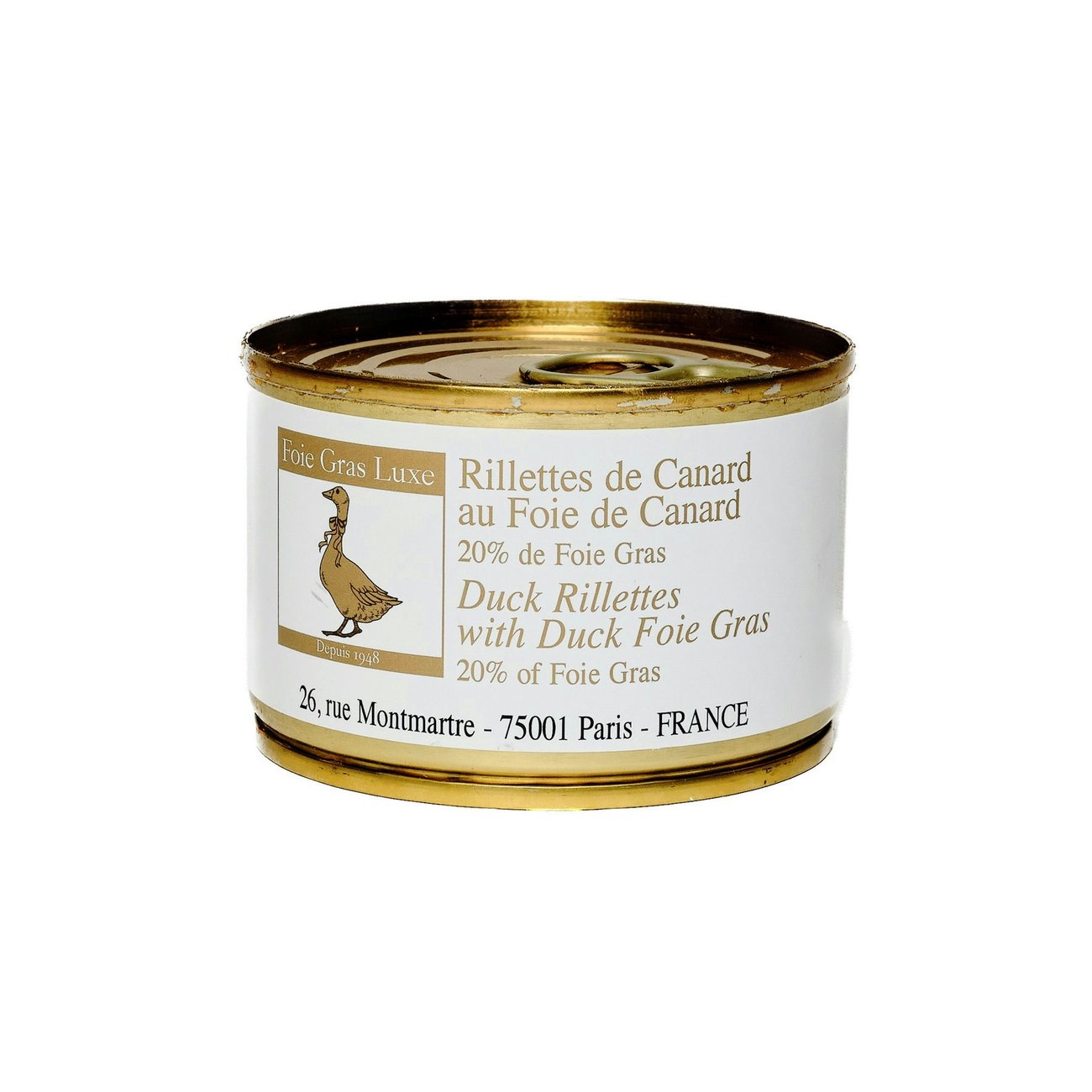 Rillettes de canard fondantes, cuisinées lentement dans leur graisse et effilochées. Une spécialité délicieuse mariant viande de canard et morceaux de foie gras. Parfaites sur une tranche de pain grillé.