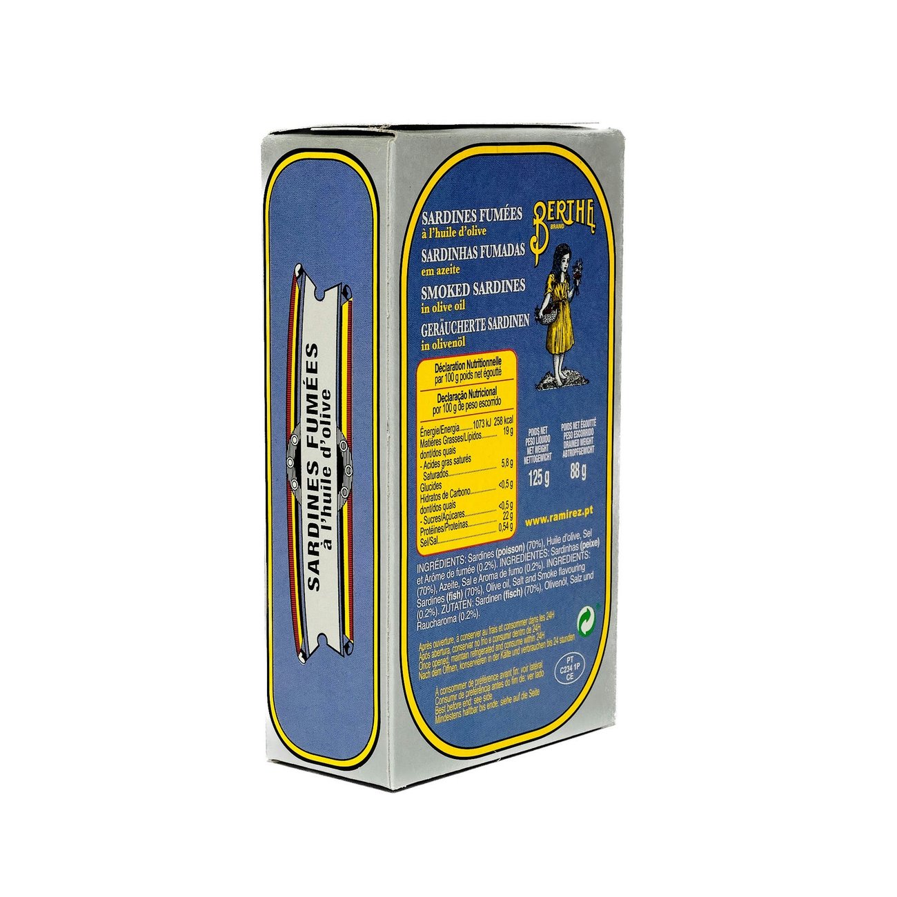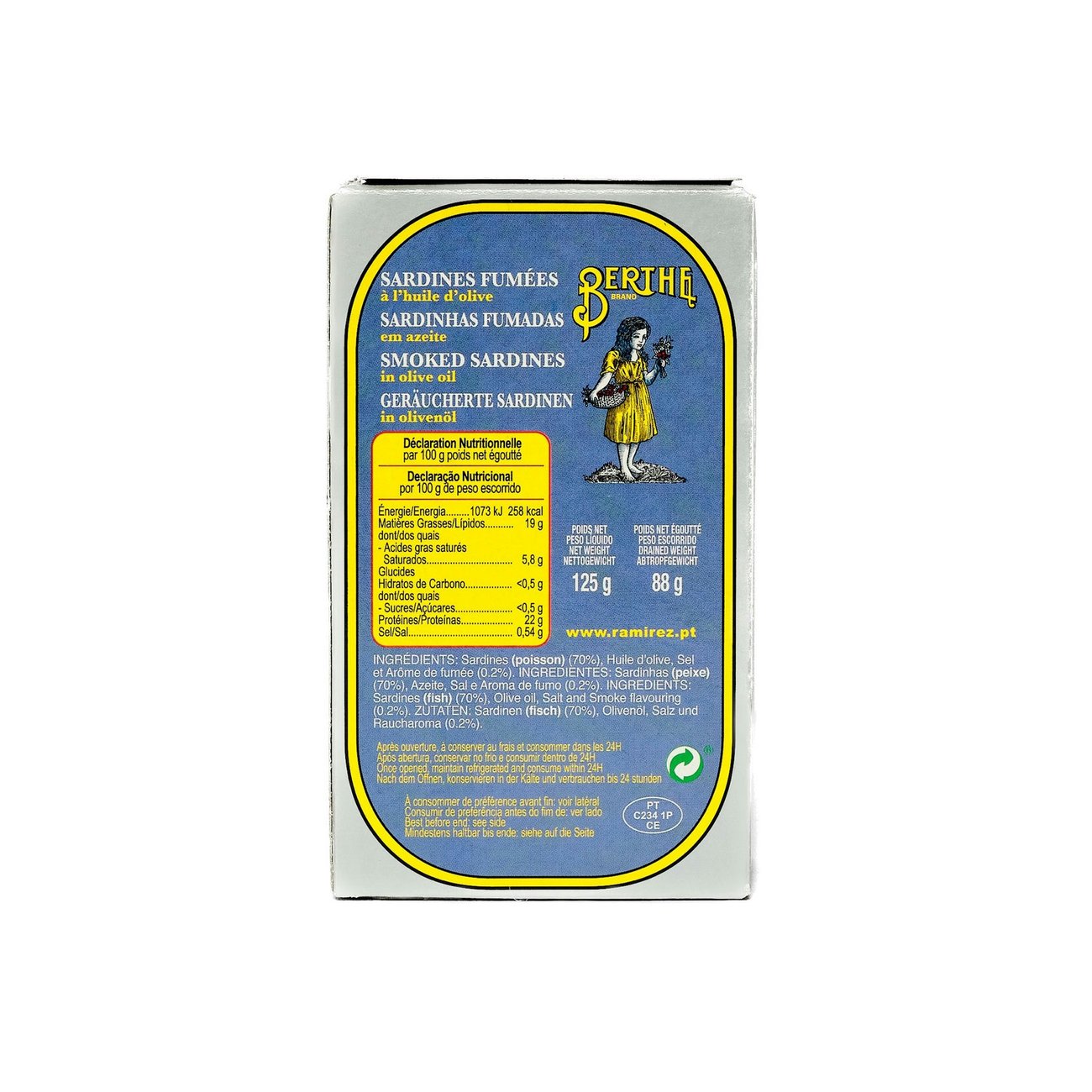 • Ingrédients: Sardines (Poisson), Huile d'olive, Sel et Arôme de fumée.